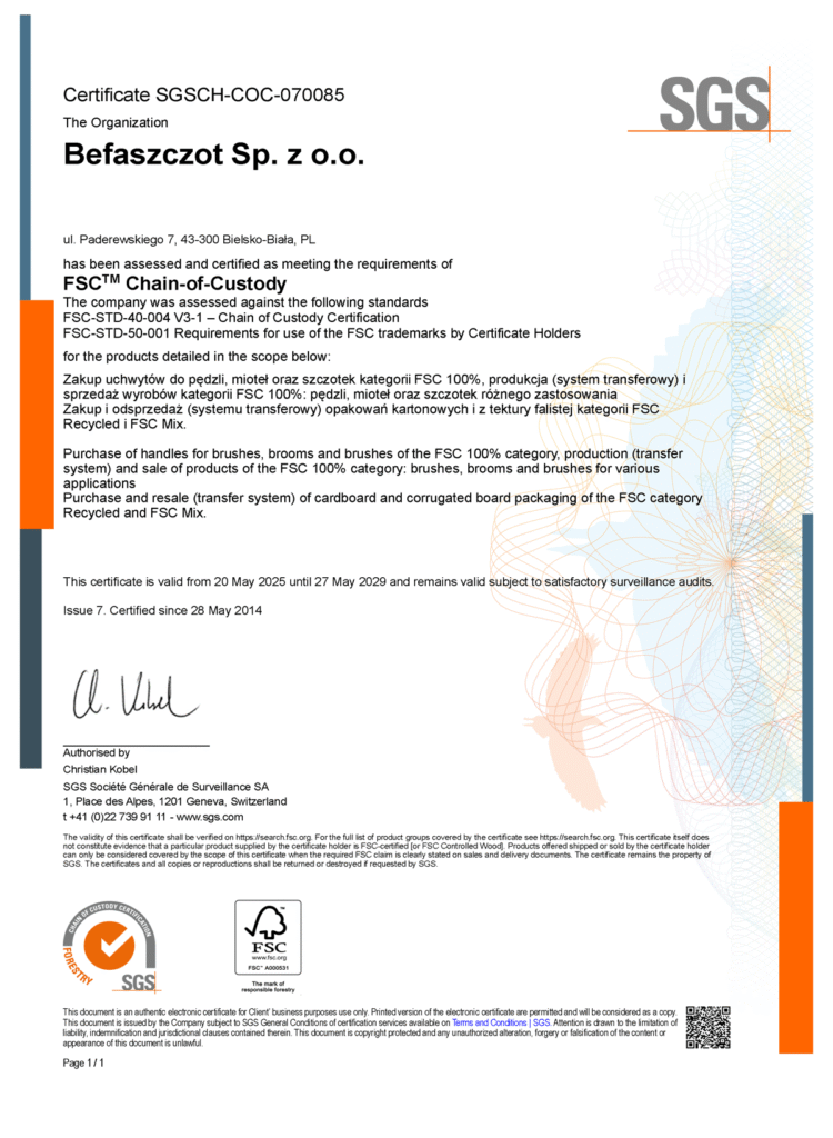 The FSC® Chain-of-Custody certificate, issued by the certification body SGS, confirms our ability to trace the origin of raw materials (wood) from certified sources through to the final product. Our company operates under the transfer system with an FSC 100% claim. The scope of our FSC® certification includes the purchase of handles for brushes, brooms and brushes of the FSC 100% category, production (transfer system) and sale of products of the FSC 100% category: brushes, brooms and brushes for various applications, purchase and resale (transfer system) of carboard and corrugated board packaging of the FSC category Reycled and FSC Mix.